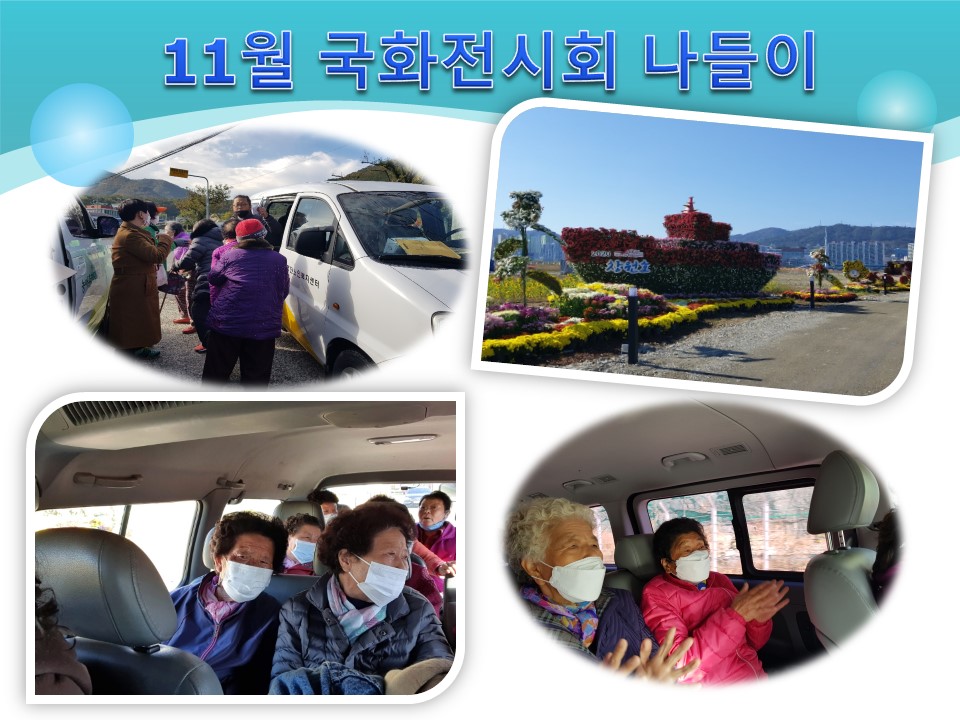 11월 4일 (수) ~ 11월5일 (목) 이틀 간 명진노인통합지원센터에서는 지역 어르신 및 대상 어르신들을 모시고 마산 국화전시회 나들이를 다녀왔습니다.