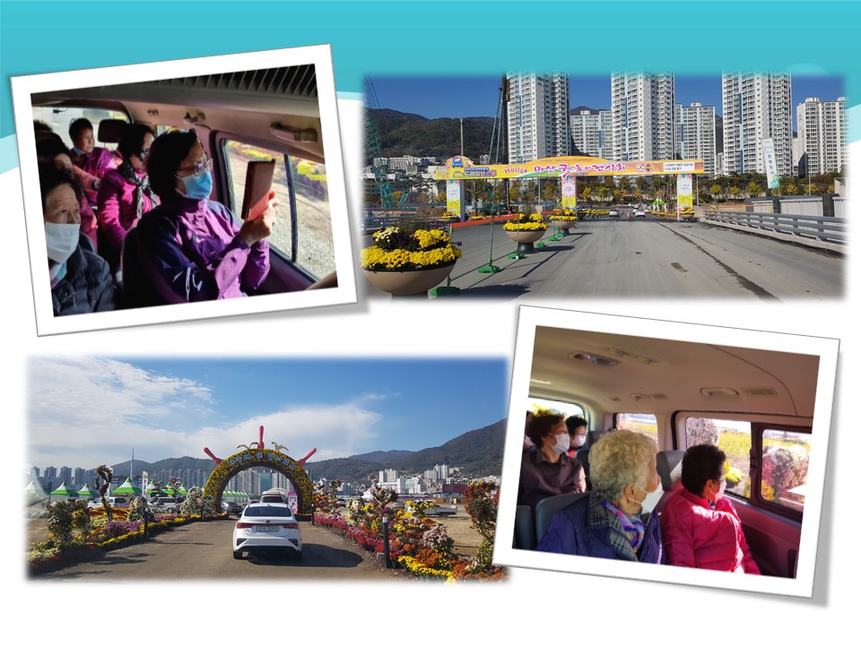 행사장을 어르신들이 직접 걸어볼 수는 없었지만, 오히려 넓은 행사장에 예쁘게 피어 있는 국화꽃들을 자동차에서 편하게 구경하실 수 있다며 더욱 즐거워하셨습니다.