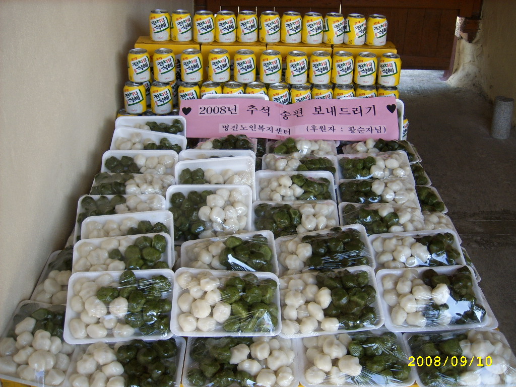추석맞이 사랑의 송편 나누기로 풍성하고 즐거운 명절 분위기를 만들어 주신 황순자 후원자님 감사드립니다. 보내주신 송편과 식혜는 9월 10일 대상 어르신 60가구 소중하게 전달되었습니다. [이 게시물은 관리자님에 의해 2013-05-16 15:09:45 요양원-갤러리에서 이동 됨]