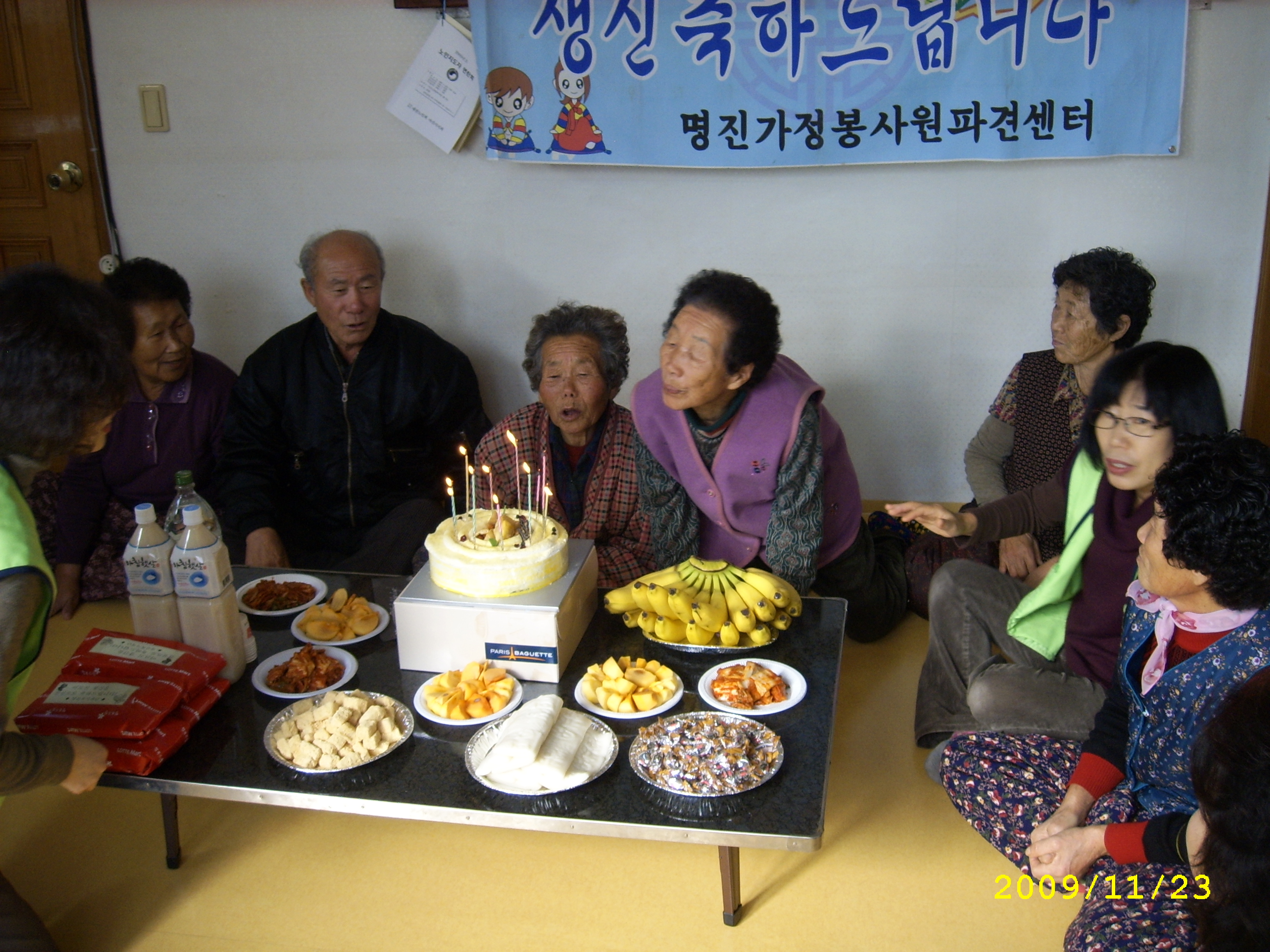 욱곡 마을회관에서 생신잔치를 했습니다~ 명진노인복지센터 대상 어르신들뿐만 아니라 마을 어르신들의 참여로 북적이는 하루 보냈습니다~ 기분이 좋아지신 어르신들이 노래도 한곡 뽑으셨답니다~! 그리고 사회복지사 선생님과 요양보호사 선생님께서 끓인 칼국수를 모두 나눠 먹었답니다! 정말 맛있었어요~ [이 게시물은 관리자님에 의해 2013-05-16 15:15:38 요양원-갤러리에서 이동 됨]