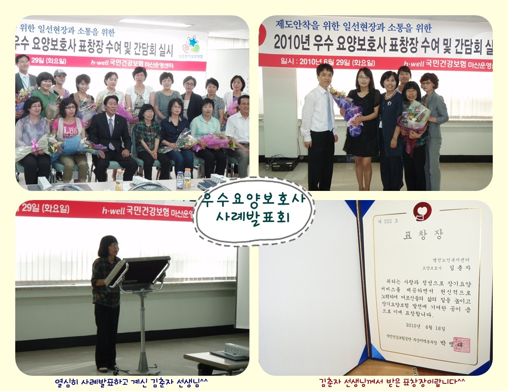 명진노인복지센터의 요양보호사 김춘자 선생님께서 우수요양보호사로 선정되고 사례발표를 하셨답니다^^ 발표를 들으면서 마음이 짠했는데요~ 앞으로도 어르신들을 위해서 힘써주시고 듬직한 딸이 되어 주세요^^ [이 게시물은 관리자님에 의해 2013-05-16 15:16:19 요양원-갤러리에서 이동 됨]