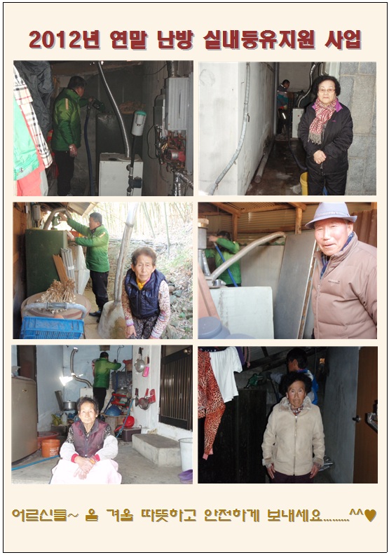 <2012년 연말 10가구 선정 실내등유 지원사업> 기간: 2012년 12월 26일 (수) ~ 2012년 12월 27일 (목) 겨울철 한파를 맞아 난방연료 지원이 필요한 재가어르신들을 대상으로 따뜻하고 건강한 겨울을 보내실 수 있도록 실내등유를 지원해드렸습니다.
