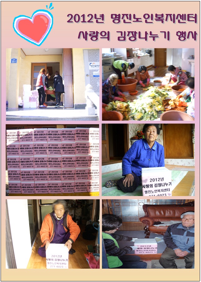 일시: 2012년 12월 20일 (목) 사랑의 김장나누기~♥ 재가어르신들 대상으로 67가구 전달 완료했습니다. 추운 겨울.. 작지만 어르신들 밥상에 훈훈한 정을 더해드리길...... 수고하신 자원봉사자님들, 직원 여러분 감사합니다~