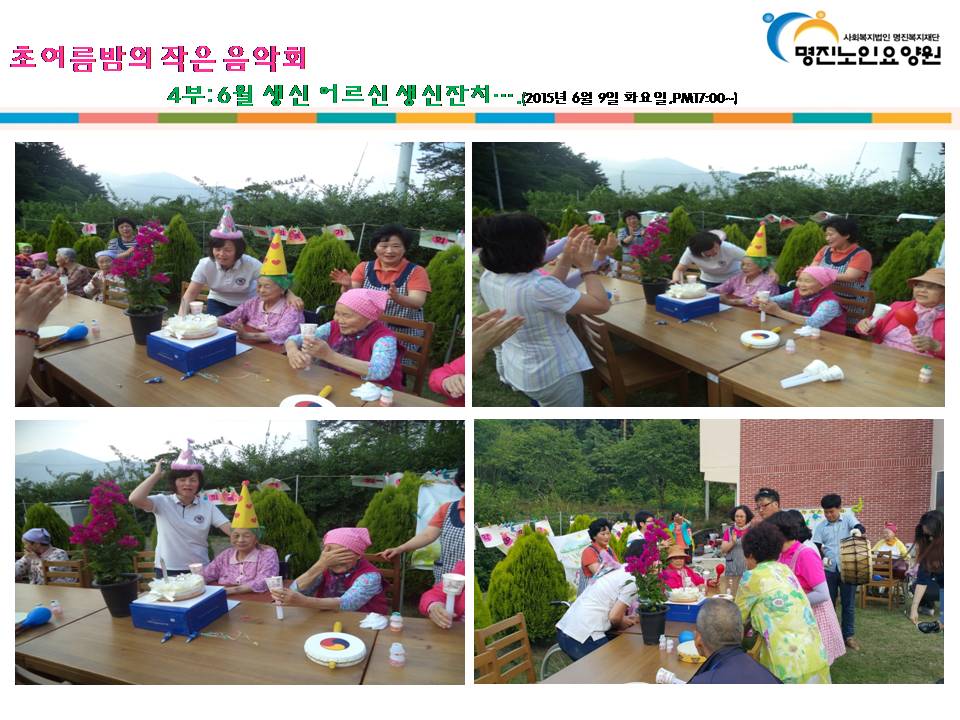 제4부 6월 생신잔치였습니다. 윤병오 어르신, 최순금 어르신 두 분 앞으로도 지금처럼 건강 하세요. 윤병오 어르신은 생신잔치 이전에 들어가시는 바람에..... 축하드리지 못했네요.
