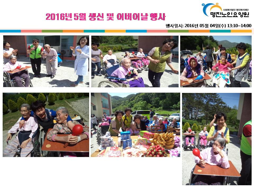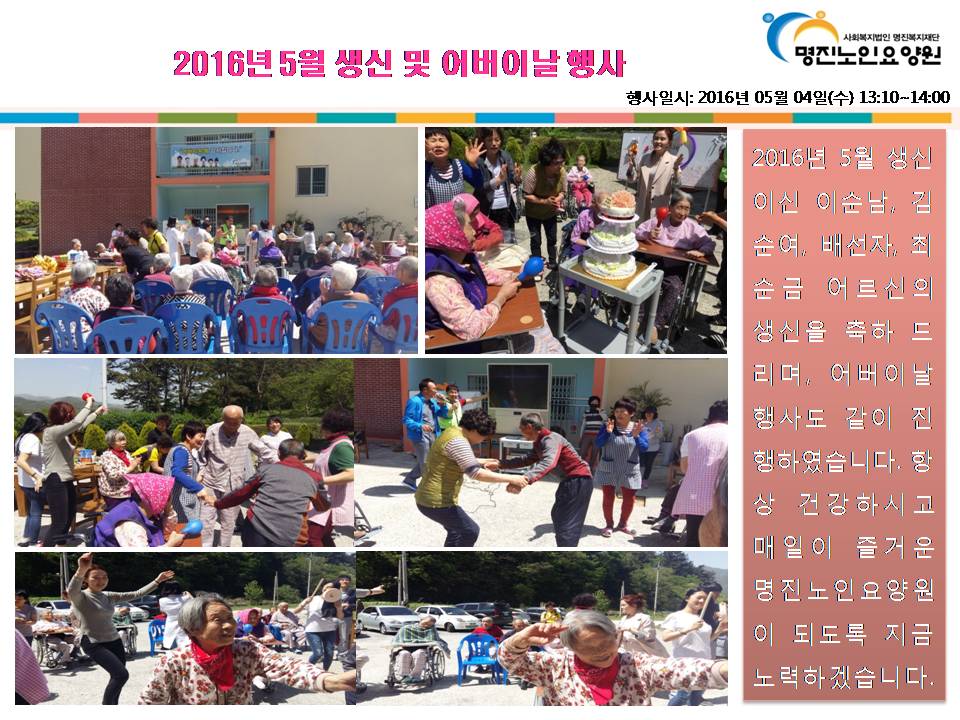 2016년 5월 생신이신 이순남, 김순여, 배선자, 최순금 어르신 생신을 축하드립니다.