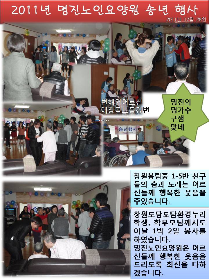 요양원 송년행사를 위해 공연해주신 창원봉림중 1-5반 학생들과, 창원도담도담환경누리 회원 및 학부모님께서도 1박2일 소중한 시간을 봉사해주셨습니다. 이날 어르신들의 행복한 웃음에서 일하는 보람을 느꼈고 공연과 봉사를 해 주신 고마운 학생, 학부모님들의 가정에 언제나 행복이 가득하시고 우리학생들도 항상 도전하고 성취해내는 멋진 분들이기 바랍니다. 화이팅!!!!!!!