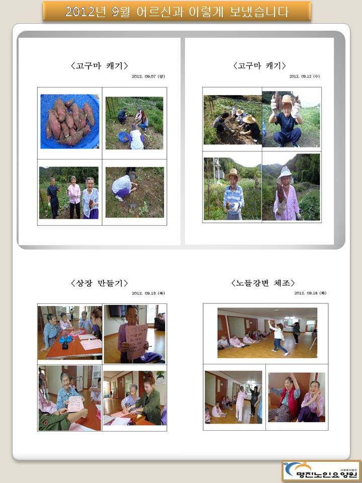 9월이네요.....어르신께 웃음을 드리겠다고 약한한지 꼭 한달이네요 다름 많이 웃었습니다. 고구마 캐기 기타 등등 고무마캐는 모습에서 참 열심히 사는 젊은 날의 그들이 상상이 됩니다.
