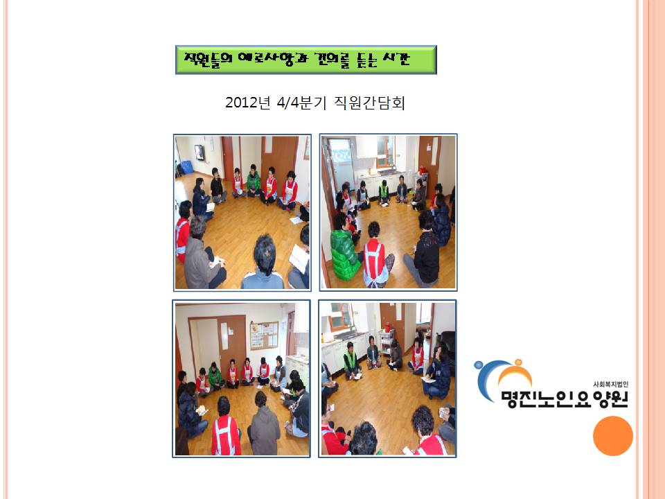 추운 날씨에 수고하시는 직원 여러분의 모임입니다. 근무편성과 프로그램에 대한 의견이 있었습니다. 개인에게 최대한 맞춰줄 수 있는 근무편성과 프로그램 수행이 원활하도록 의견을 모았습니다.