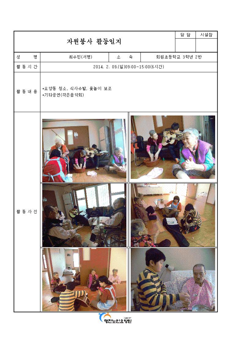 회원초등학교 3학년 최수민 군은 종종 명진노인요양원에 아침 일찍와 정말 작은 사랑을 실천하고 가는 학생입니다. 청소도 돕고, 식사수발, 족욕, 기타로 작은 음악회까지 정말 어르신들을 즐겁게 해 주는 작은 학생입니다. 이런 참 마음이 시설 어르신들껜 큰 기쁨이고 큰 선물입니다. 수민아 지금처럼 몸과 정신이 건강한 대한민국의 청년으로 잘 자라주길 바랍니다. 종종 와 어르신들께 작은음악회 부탁한다.
