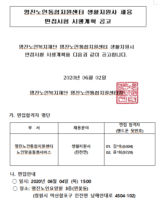명진노인통합지원센터 노인맞춤돌봄서비스 생활지원사(진전면) 면접 시행 공고