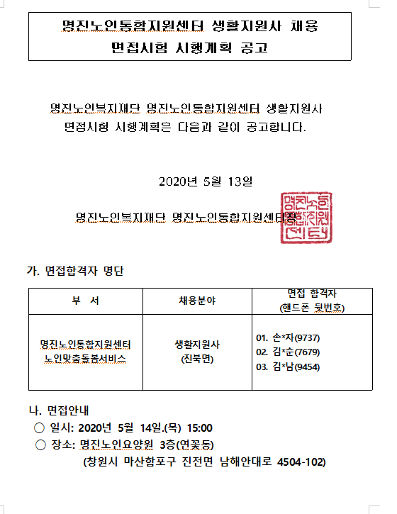 명진노인통합지원센터 노인맞춤돌봄서비스 생활지원사 면접 시행 공고